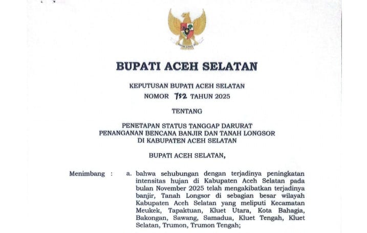 TAPAKTUAN – Penanews.co.id – Pemerintah Kabupaten Aceh Selatan resmi menetapkan Status Tanggap Darurat Penanganan Bencana Banjir dan Tanah Longsor menyusul tingginya curah hujan yang melanda wilayah tersebut sepanjang November 2025. Penetapan itu tertuang dalam Keputusan Bupati Aceh Selatan Nomor 752 Tahun 2025.