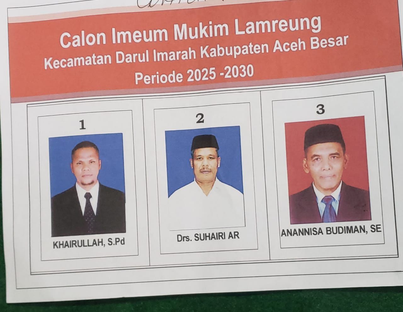 KOTA JANTHO— Penanews.co.id — Anannisa,SE resmi terpilih kembali untuk kedua kalinya sebagai Imum Lamreung, Kecamatan Darul Imarah, Kabupaten Aceh Besar, untuk periode 2025–2030. Ia unggul telak dalam pemilihan yang digelar secara demokratis di Gedung UDKP Kecamatan Darul Imarah, Lampeneurut, Aceh Besar, Selasa (16/09/2025).
