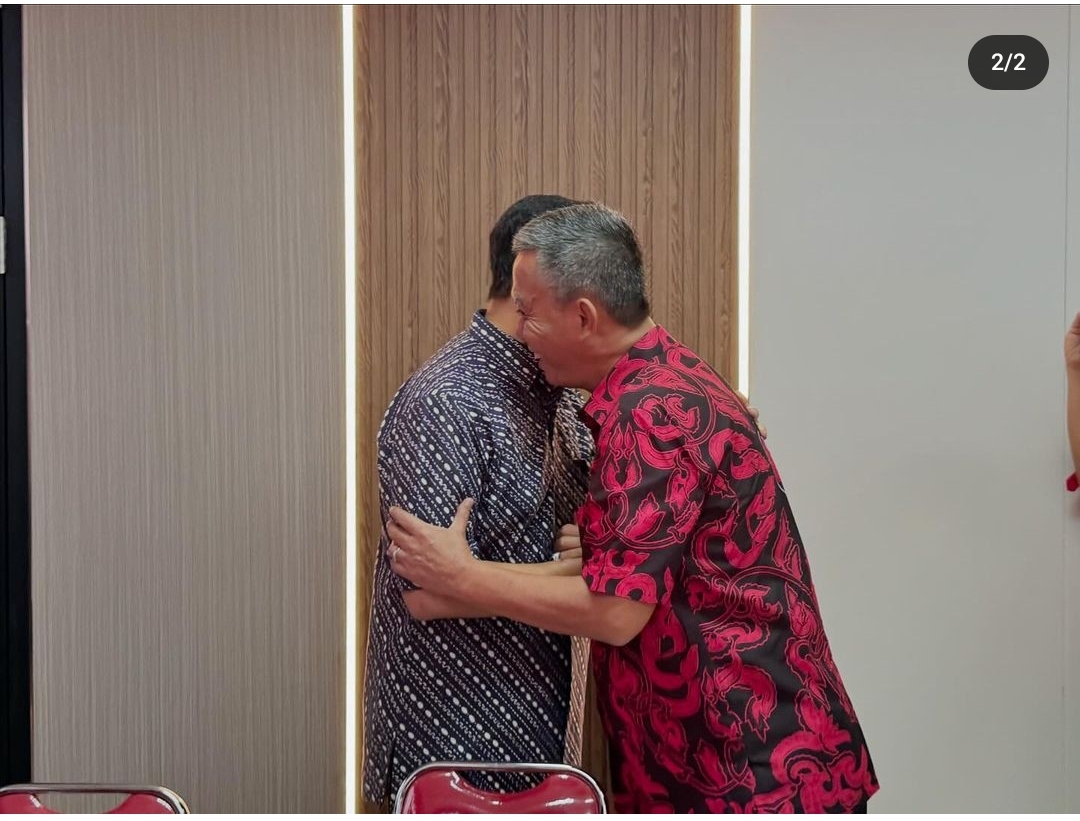 Foto kedua menampilkan mereka saling bersandar dengan pipi kanan dan kiri, sementara mereka masih dalam posisi bersalaman.