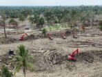 TNI Kerahkan Puluhan Alat Berat Bersihkan Tumpukan Kayu Sisa Banjir di Gampong Geudumbak, Langkahan