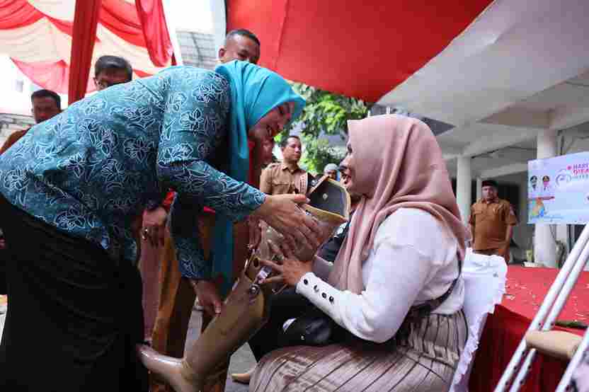 BANDA ACEH – Penanews.co.id – Ketua TP PKK Aceh Marlina Muzakir, tak dapat membendung rasa bahagianya, saat Munatunnzahra, anak Disabilitas rungu menyerahkan batik tulis karyanya, pada peringatan Hari Disabilitas Internasional (HDI) 2025, di halaman tengah Dinas Sosial Aceh, Selasa (30/12/2025).