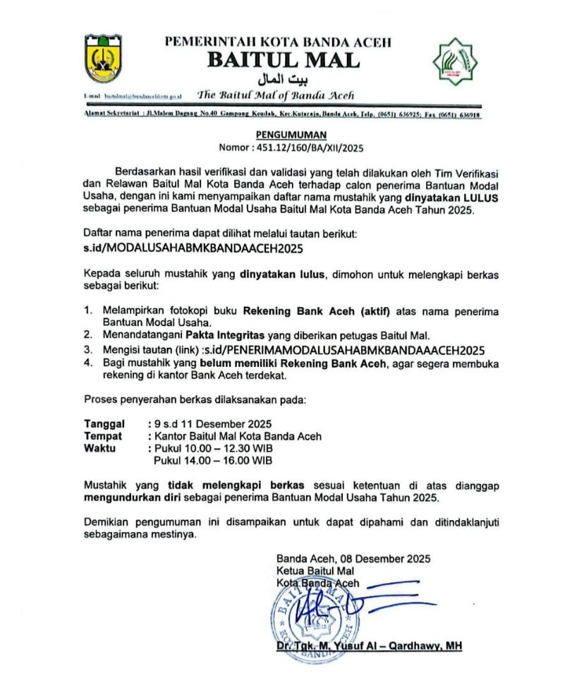 “Pengumuman nama-nama penerima dapat diakses melalui tautan: s.id/MODALUSAHABMKBANDAACEH2025,” kata Yusuf, Rabu (10/12/2025) di Kantornya.