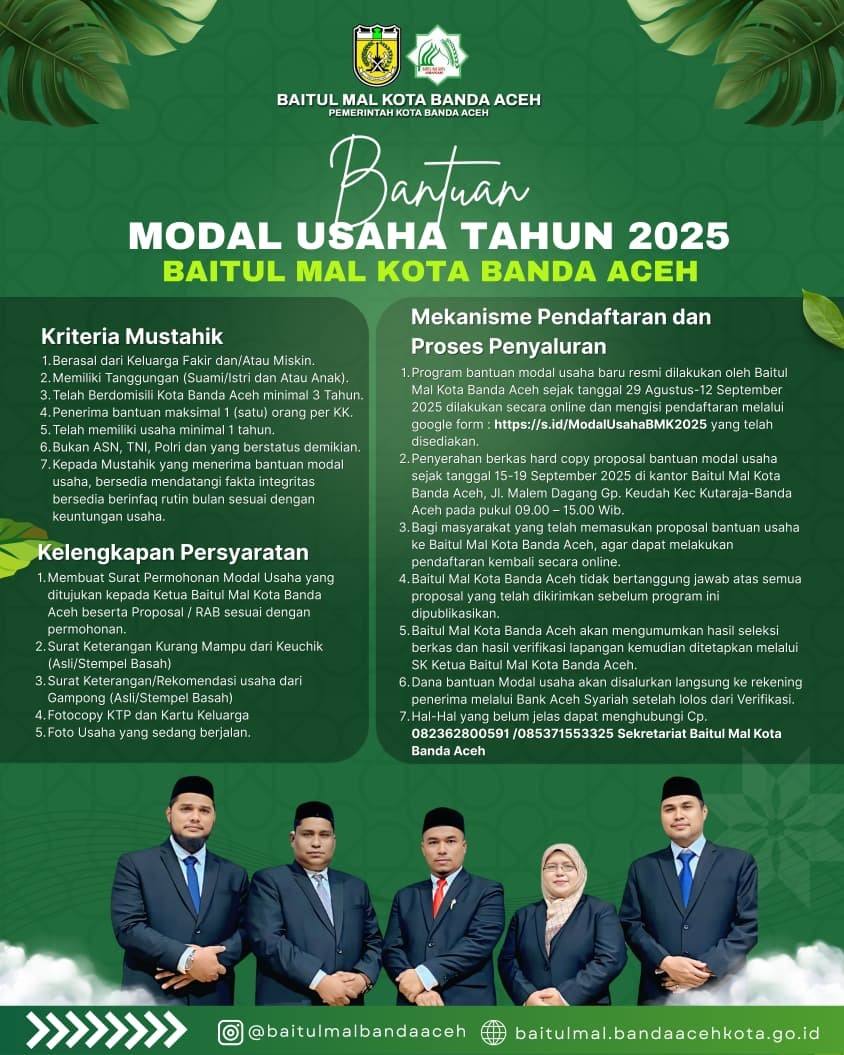 1. Program bantuan modal usaha baru resmi dilakukan oleh Baitul Mal Kota Banda Aceh sejak tanggal 29 Agustus-12 September 2025 dilakukan secara online dan mengisi pendaftaran melalui google form: https://s.id/ModalUsahaBMK2025 yang telah disediakan.