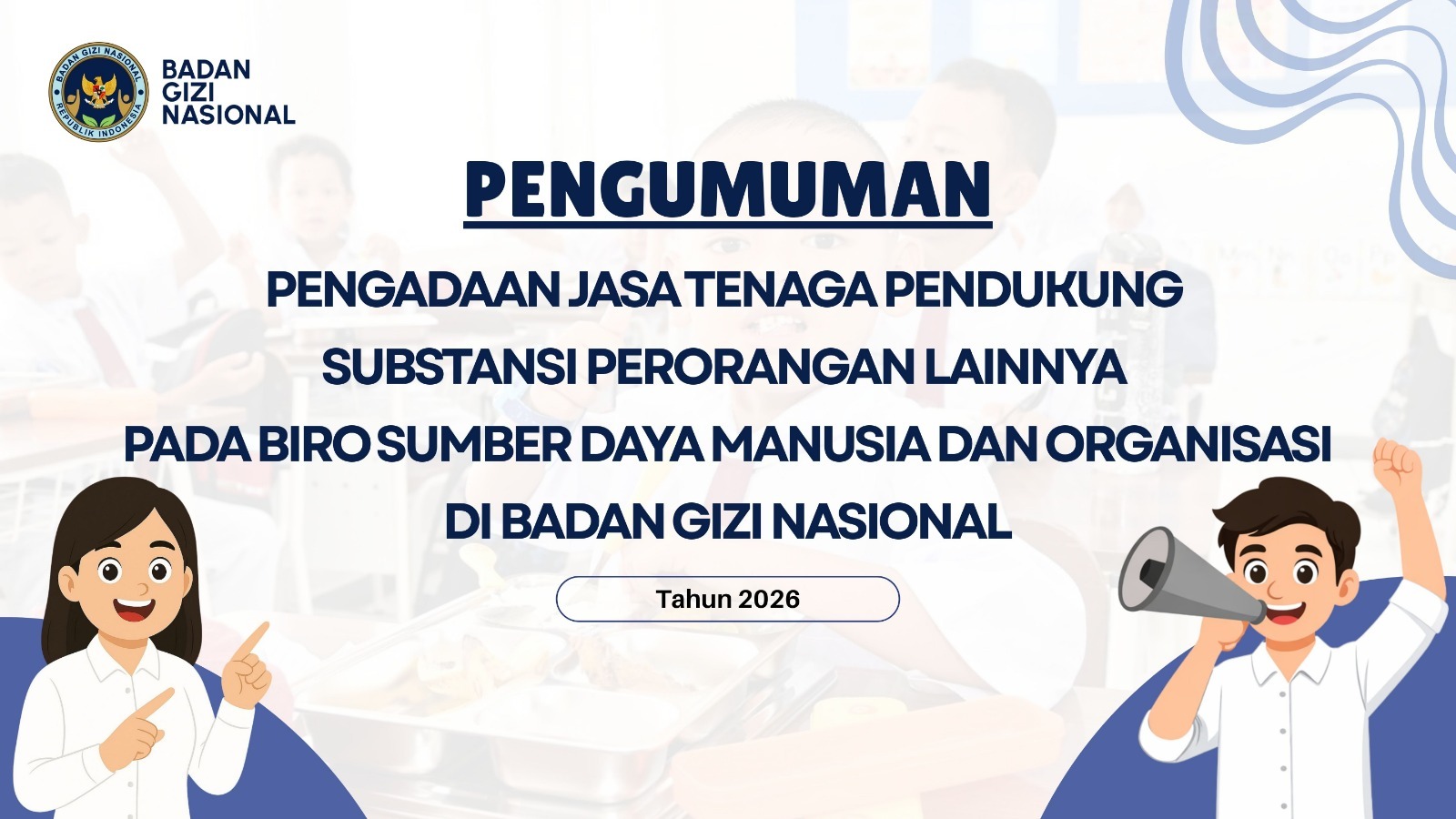 Dalam siaran pers di laman resmi BGN tanggal, 2 Pebruari 2016 Pengadaan Jasa Tenaga Pendukung Substansi Perorangan Lainnya Pada Biro Sumber Daya Manusia Dan Organisasi di Badan GIzi Nasional Dalam rangka mendukung pelaksanaan tugas dan fungsi di lingkungan kerja Biro Sumber Daya Manusia dan Organisasi Badan Gizi Nasional tahun 2026, dengan ini dibuka kesempatan bagi putra dan putri terbaik bangsa untuk bergabung menjadi tenaga pendukung sebagai: