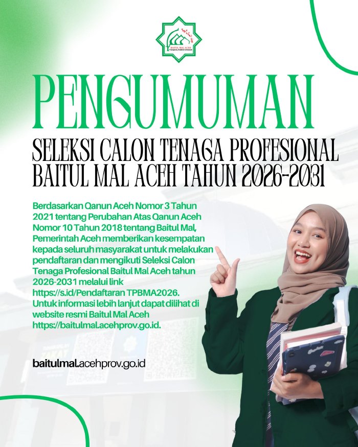 - Informasi mengenai tata cara pendaftaran dan persyaratan administrasi lainnya dapat dilihat di website resmi Baitul Mal Aceh http://baitulmal.acehprov.go.id;