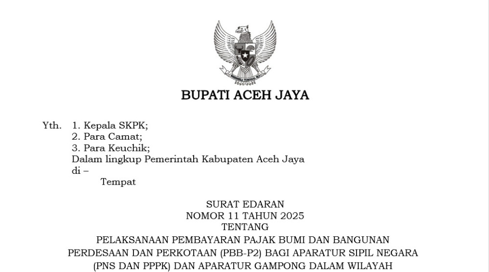 Seruan tersebut diperkuat melalui Surat Edaran Bupati Aceh Jaya Nomor 11 Tahun 2025 tentang Pelaksanaan Pembayaran PBB-P2 bagi ASN, PPPK, dan Aparatur Gampong. Surat edaran ini mengatur agar setiap aparatur melampirkan bukti lunas PBB-P2 sebelum pencairan hak-hak keuangan dilakukan.