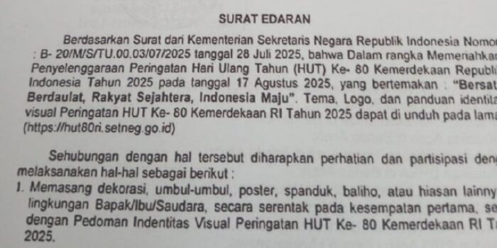 “Edaran ini ditandatangani oleh Sekretaris Daerah Dr A Murtala, MSi, merupakan tindak lanjut dari surat Kementerian Sekretaris Negara (Nomor B-20/M/S/TU.00.03/07/2025, 28 Juli 2025) yang memuat tema, logo, serta panduan identitas visual HUT ke-80 RI,” kata Halidi, SSos, MM, Kepala Dinas Komunikasi, Informatika, dan Persandian Aceh Utara.