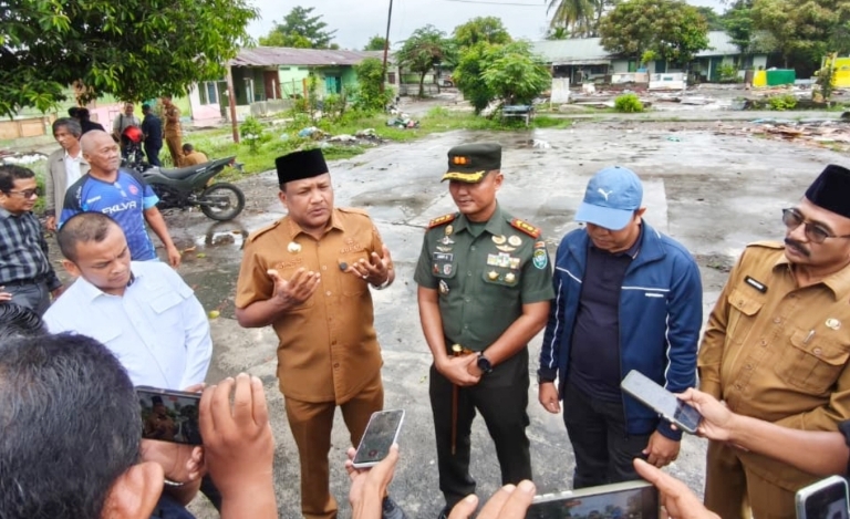 Bupati Bireuen, H. Mukhlis didampingi Dandim 0111 Bireuen, Letkol Arh Luthfi Novriadi, Ketua DPRK Juniadi serta sejumlah pejabat memberi keterangan kepada wartawan di lokasi lahan milik TNI yang dihibah untuk Pemkab Bireuen, Senin, 24 November 2025. | Foto: Rizanur/Kabar Bireuen