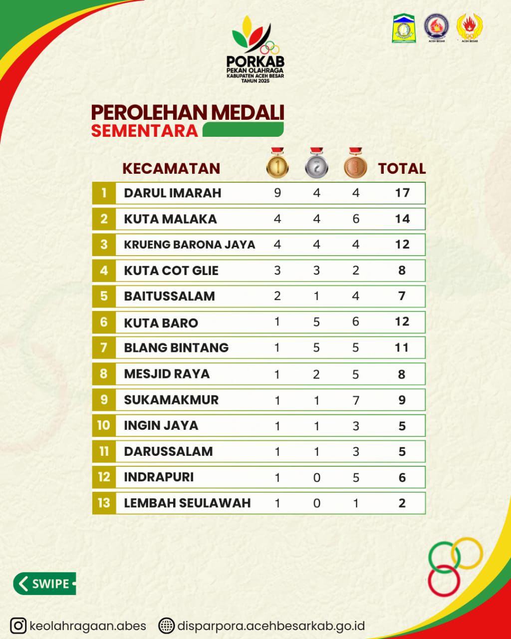 KOTA JANTHO — Penanews.co.id — Sampai hari ketiga perhelatan Pekan Olahraga Kabupaten Aceh Besar (PORKAB) 2025, Kontingen Darul Imarah masih memimpin perolehan medali, Kecamatan yang dipimpin Muhammad Basir SSTP, MSi itu telah mengumpulkan 17 medali, yaitu 9 emas, 4 perak dan 4 perunggu.