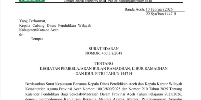 BANDA ACEH — Dinas Pendidikan Aceh resmi menerbitkan Surat Edaran Nomor 400.3.8/2048 tentang Kegiatan Pembelajaran Bulan Ramadhan, Libur Ramadhan dan Idul Fitri 1447 … Continue reading Disdik Aceh Terbitkan Edaran Pembelajaran Ramadhan 1447 H, untuk Sekolah ini