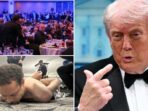 Dia muncul sekitar semenit kemudian, topi merahnya yang bertuliskan “Make America Great Again” terlepas, dan terdengar berkata “tunggu, tunggu”, sebelum para agen mengantarnya ke dalam kendaraan.