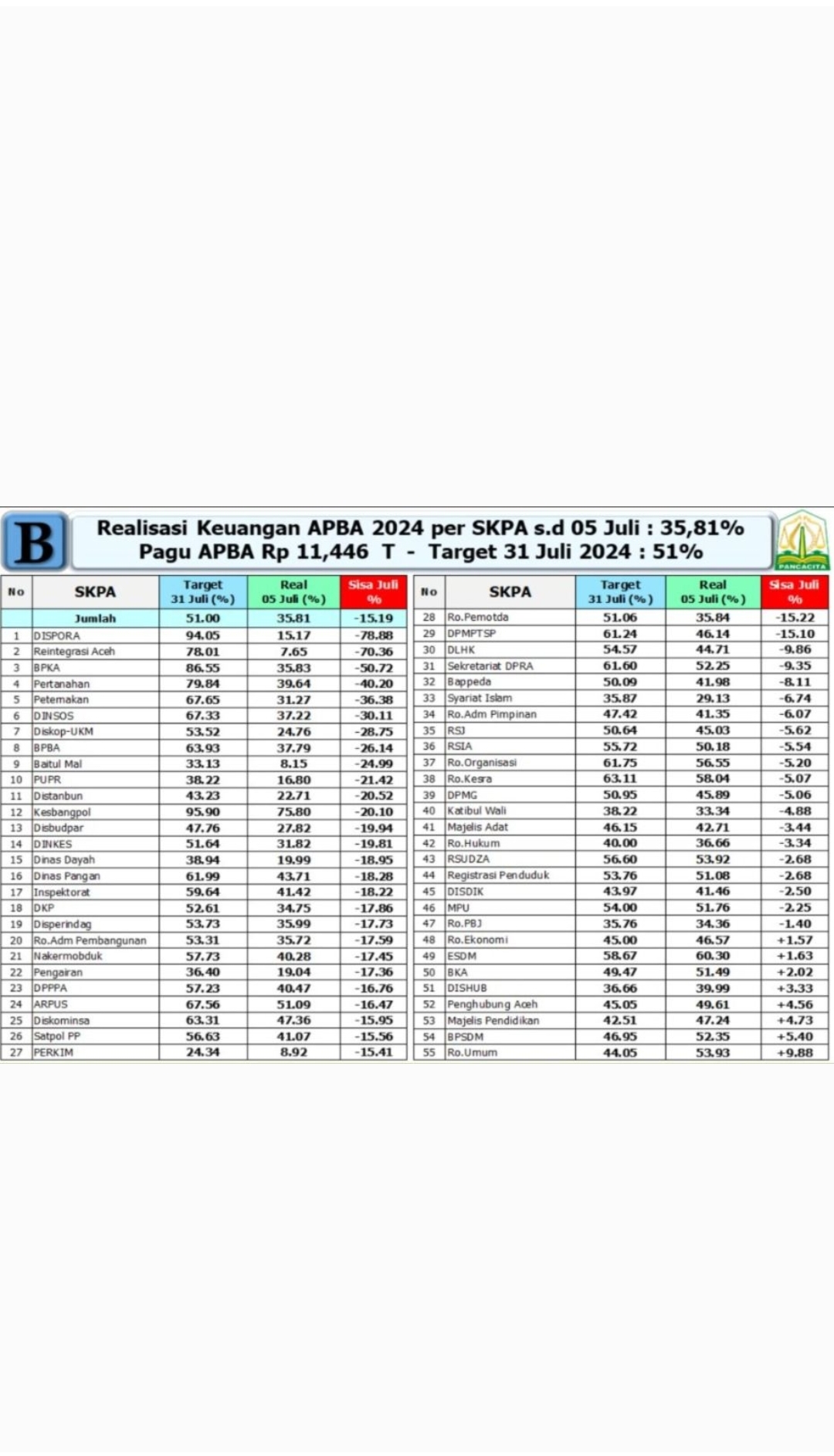 BANDA ACEH – Penanews.co.id — Melihat kondisi serta realisasi belanja publik Anggaran Pendapatan dan Belanja Aceh 2024 per 5 Juli 2024, rata-rata bahkan secara umum dibawah lima puluh persen.