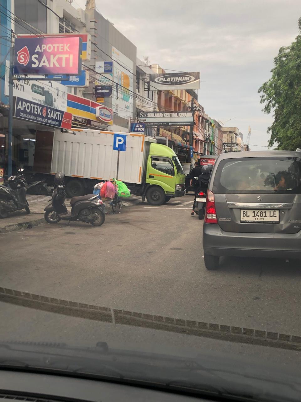 Selain itu, macet nya kenderaan yang menggunakan jalur jalan tersebut juga terjadi karena kenderaan bongkar barang disalah satu toko modern/Supermarket, berparkir mengena badan jalan.
