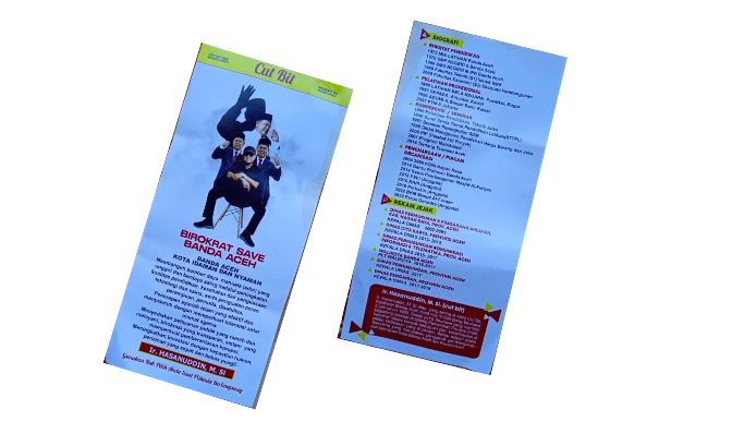 Brosur yang dibagikan oleh para Gen-Z di seputaran Taman Ratu Safiatuddin (Taman PKA) itu berisi biodata yang menjelaskan pengalaman kerja dan riwayat pendidikan mantan Kepala Dinas Permukiman dan Prasarana Wilayah Kabupaten Nagan Raya tersebut. Di salah satu halaman mencantumkan program kerja Hasanuddin jika kelak memimpin Banda Aceh.