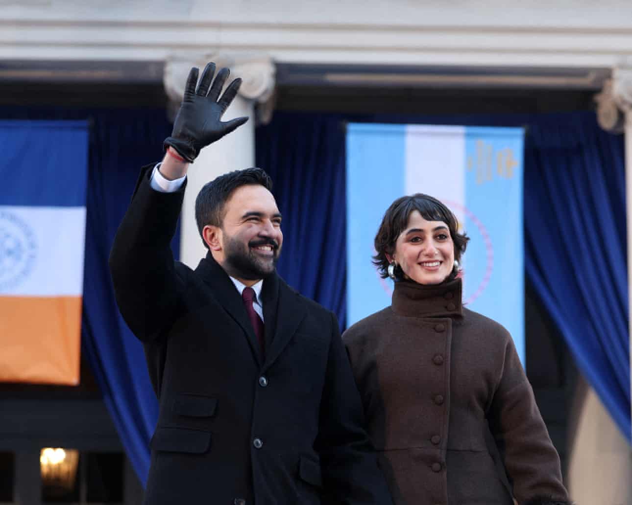 Di tangga balai kota pada hari Januari yang sangat dingin, Mamdani diperkenalkan oleh anggota Kongres dari Partai Demokrat, Alexandria Ocasio-Cortez , seorang sekutu sosialis demokrat yang sedang bersiap untuk mencalonkan diri sebagai presiden pada tahun 2028.
