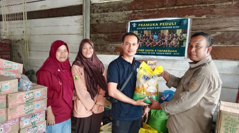 NAGAN RAYA –Penanews.co.id – Gugus Depan Pramuka SLTPN 4 Tapaktuan, Kabupaten Aceh Selatan, menyerahkan bantuan kemanusiaan dari untuk korban bencana banjir bandang yang melanda Kecamatan Beutong Ateuh, Kabupaten Nagan Raya melalui Polres Nagan Raya