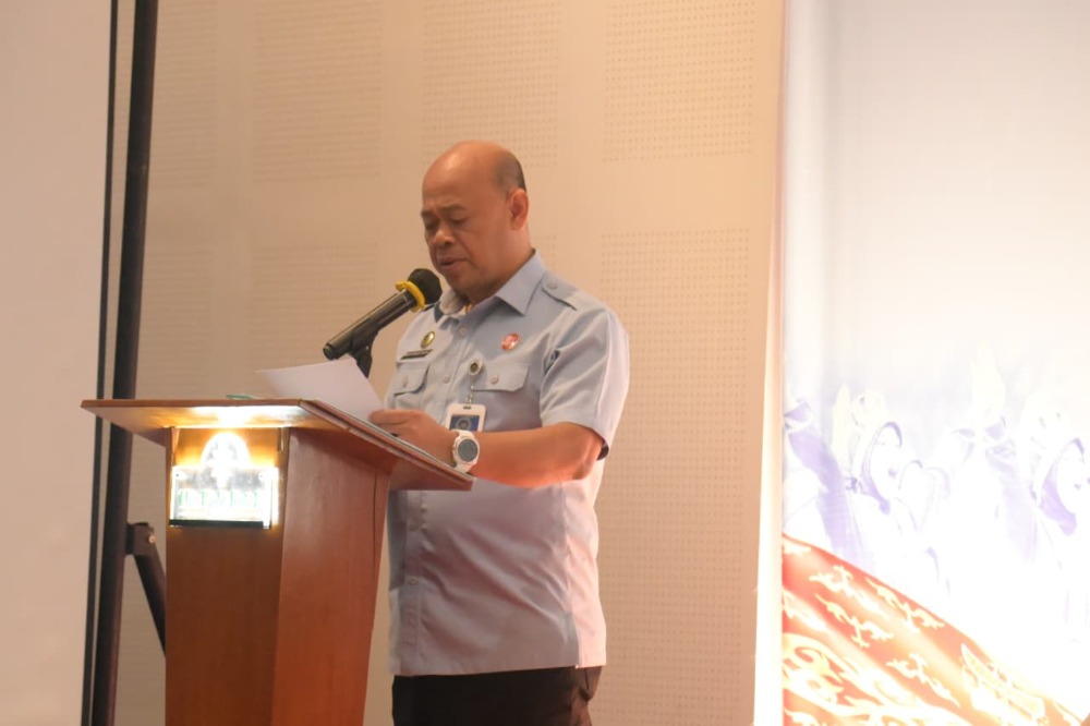 Direktur Bidang Penyediaan dan Penyaluran Makanan MBG Wilayah I, Wahyu Widisentyanta, memberi sambutan pada Bimtek Penjamah Makanan Program MBG Wilayah I yang digelar oleh BGN RI di The Pade Hotel, Kecamatan Darul Imarah, Aceh Besar, Sabtu (21/9/2025). FOTO/MC ACEH BESAR