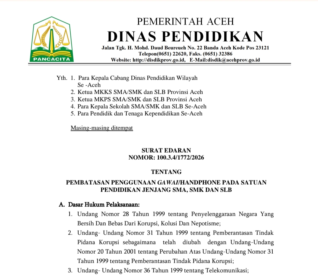 Plt Kepala Dinas Pendidikan Aceh, Murthalamuddin, S.Pd., MSP menyampaikan bahwa kebijakan ini bukanlah bentuk penolakan terhadap perkembangan teknologi, melainkan upaya menempatkan teknologi sesuai dengan fungsi dan porsinya dalam dunia pendidikan.