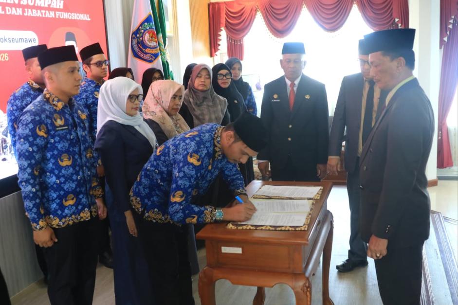 LHOKSEUMAWE – Penanews.co.id – Sekretaris Daerah (Sekda) Kota Lhokseumawe, A. Haris, S.Sos., M.Si., melantik dan mengambil sumpah 20 pejabat Administrator, Pengawas, dan Fungsional Tertentu di lingkungan Pemerintah Kota Lhokseumawe. Pelantikan berlangsung di Aula Kantor Wali Kota Lhokseumawe, Rabu siang (4/2/2026).