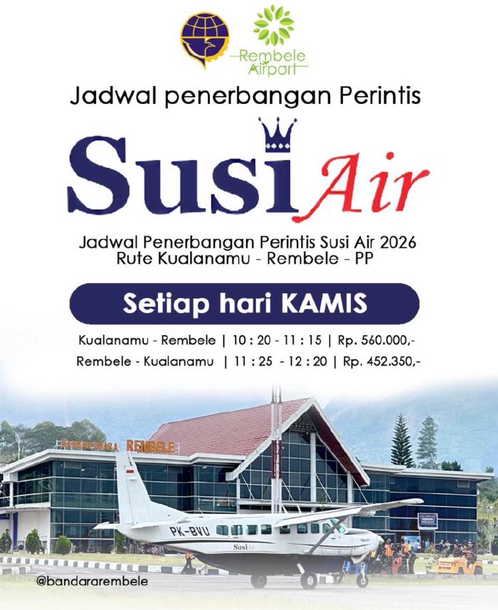 REDELONG – Penanews.co.id – Kabar baik bagi masyarakat di wilayah Gayo dan Sumatera Utara. Maskapai Susi Air secara resmi telah merilis jadwal penerbangan perintis untuk rute Kualanamu (Medan) – Rembele (Bener Meriah) Pulang-Pergi (PP) untuk kalender tahun 2026.