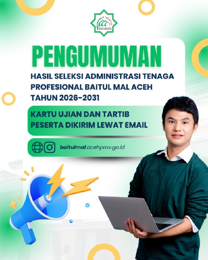 BMA memberitahukan kepada peserta Seleksi Tenaga Profesional Baitul Mal Aceh Periode 2026–2031 yang telah lulus administrasi, bahwa kartu ujian dan tata tertib peserta telah dikirimkan ke alamat email masing-masing yang digunakan saat mendaftar.