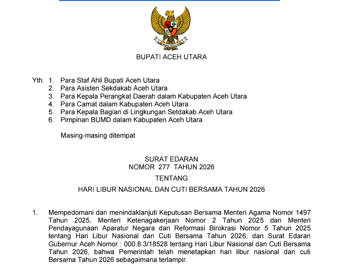 Jelang Hari Raya Idul Fitri 1447 H, Bupati Aceh Utara Keluarkan Edaran Hari Libur Nasional dan Cuti Bersama Tahun 2026