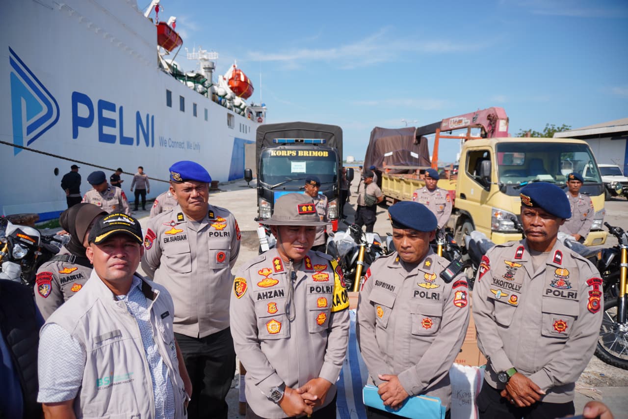 “Pada hari ini Polres Lhokseumawe menerima bantuan logistik dari Mabes Polri berupa satu unit truk sembako, 13 unit sepeda motor Honda CRF 150 L yang diperuntukkan bagi Brimobda Polda Aceh, serta dua unit swab boat untuk mendukung operasional Satpolairud,” ujar AKBP Dr. Ahzan usai menyambut kedatangan Kapal MV Egon.