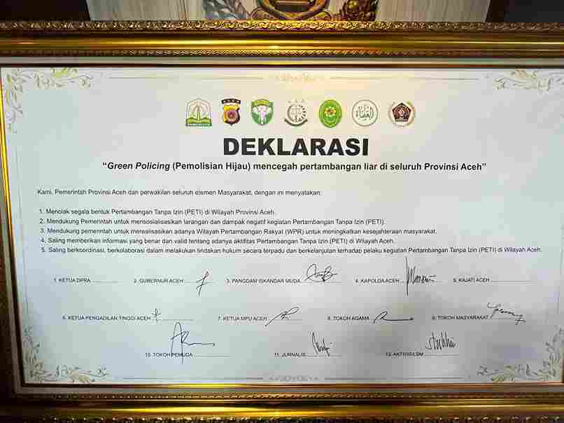 Dalam deklarasi yang turut dihadiri Wakil Gubernur Aceh, Fadhlullah, dilakukan penandatanganan bersama sebagai komitmen untuk menolak segala bentuk Pertambangan Tanpa Izin (PETI) di Aceh.