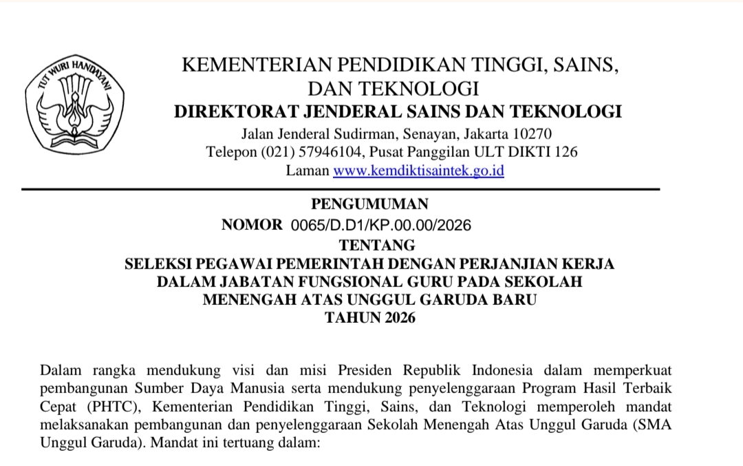 BANDA ACEH – Penanews.co.id – Kementerian Pendidikan Tinggi, Sains, dan Teknologi (Kemdiktisaintek) membuka rekrutmen 96 guru Pegawai Pemerintah dengan Perjanjian Kerja (PPPK) untuk SMA Unggul Garuda Baru mulai Senin (2/2/2026). Para pengajar yang lolos seleksi akan ditempatkan di empat lokasi, yaitu