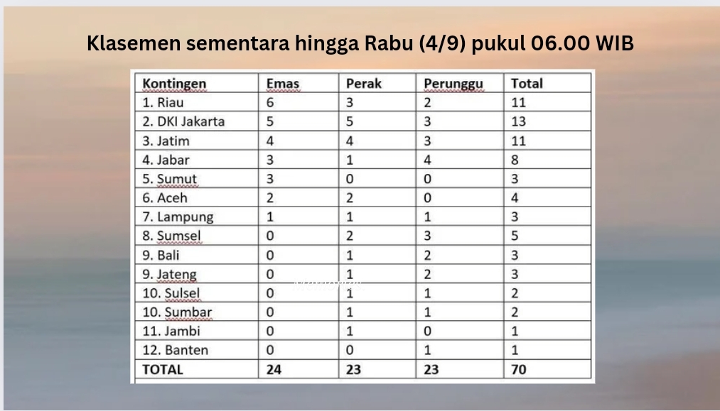 Klasemen sementara hingga Rabu (4/9) pukul 06.00 WIB :