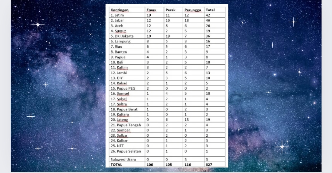Sementara itu, Sumatara Utara yang juga donasikan 12 emas ada ditangga keempat, hanya terpaut 6 medali perak dari Aceh.