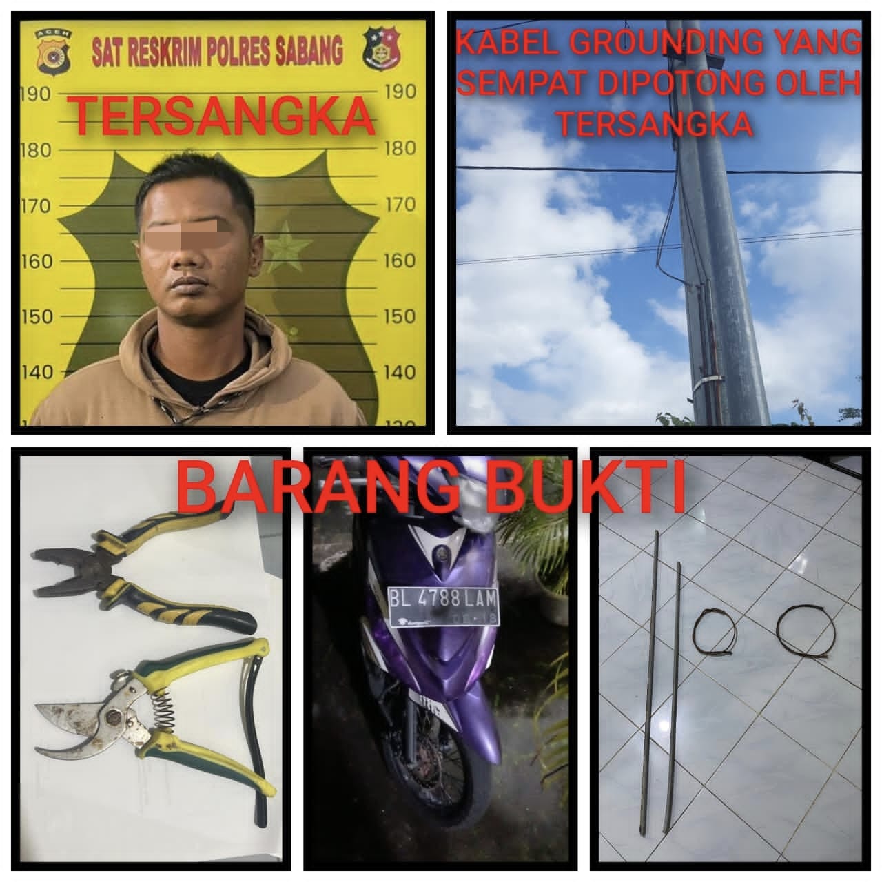 Barang bukti yang diamankan berupa, 1 unit sepeda motor Yamaha Mio J warna ungu, 1 buah tang, 2 (dua) buah pipa pelindung kabel, 2 buah gulungan kabel grounding, Atas perbuatannya, tersangka dipersangkakan melanggar Pasal 477 ayat (1) huruf f Jo Pasal 17 ayat (1) dan ayat (3) UU Nomor 1 Tahun 2023 tentang KUHP, dengan ancaman hukuman kurungan penjara selama 4 tahun 8 bulan, atau ⅔ dari ancaman pidana pokok 7 tahun penjara.