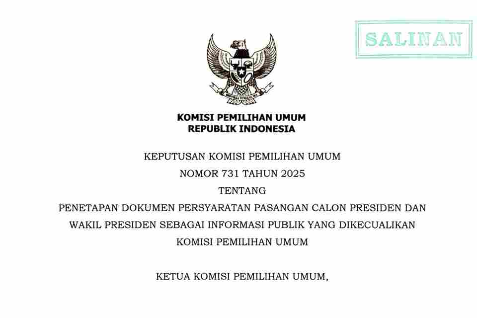 Ketentuan ini tertuang dalam Keputusan KPU RI Nomor 731 Tahun 2025 mengenai Penetapan Dokumen Persyaratan Pasangan Calon Presiden dan Wakil Presiden sebagai Informasi Publik yang Dikecualikan. Dokumen ini ditandatangani oleh Ketua KPU, Affifuddin, pada tanggal 21 Agustus 2025, dikutip, Senin, (15/09/2025).