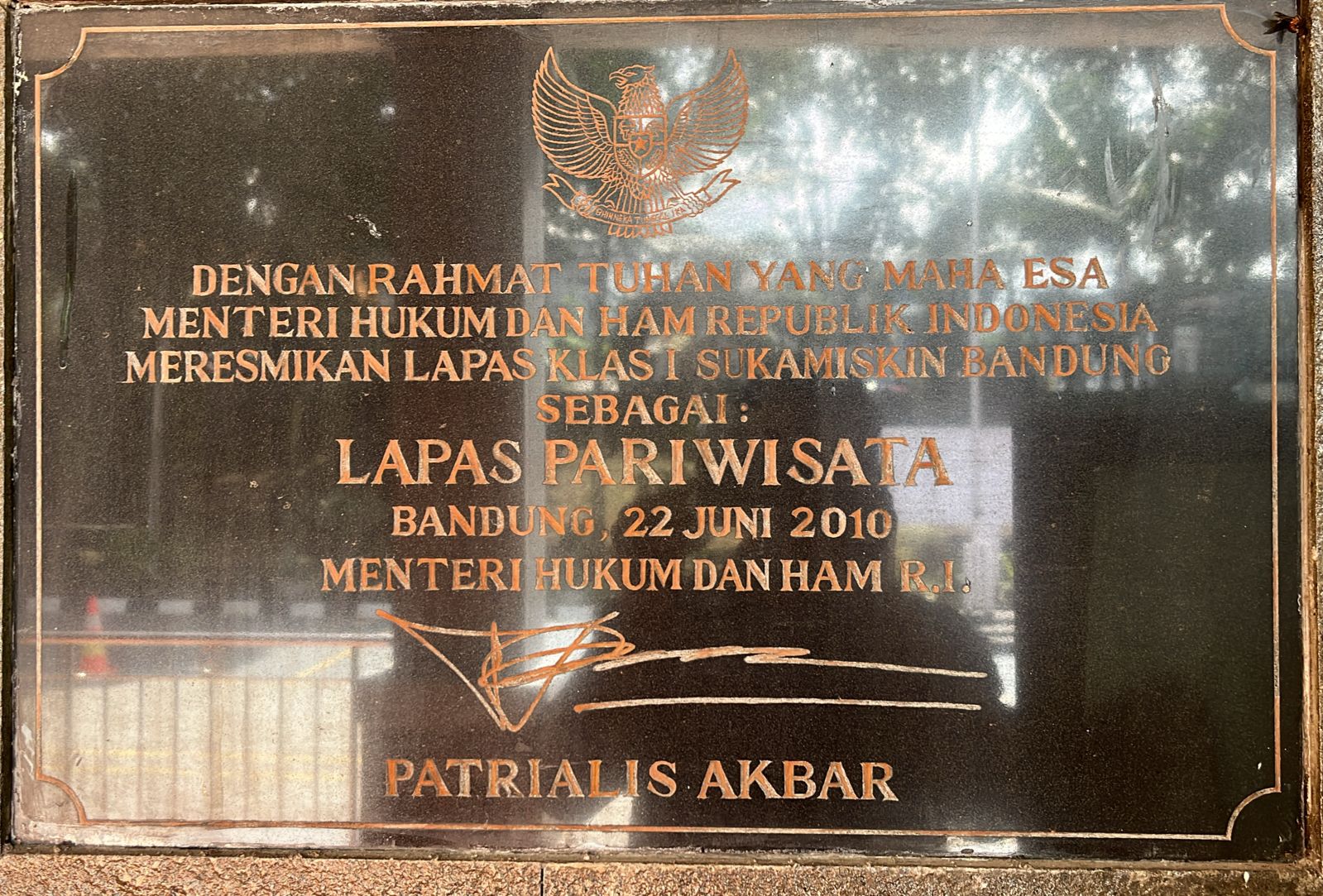 Tanpa disengaja mata ini tertuju pada, prasasti penandatanganan peresmian lapas kelas I sukamiskin Bandung, sebagai LAPAS PARIWISATA oleh Menteri Hukum dan HAM Patrialis Akbar dan Walikota Bandung Dada Rosada. Terbersit rasa tidak percaya atas apa yang baru dilihat. Bagaimana mungkin lapas yang penuh cerita horor dan ruangan-ruangan berterali besi, diisi oleh para penjahat yang telah dijatuhi vonis hukum, kemudian penyebutannya diubah menjadi Lapas Pariwisata.