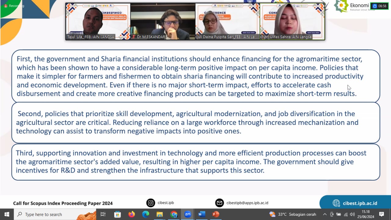 Artikel yang dipresentasikan berjudul “The Role of Islamic Finance, Workers and Value Added in the Agromaritime Sector on Economic Growth: A Study of Indonesia, Malaysia and Brunei Darussalam”, kata Juli Dwina