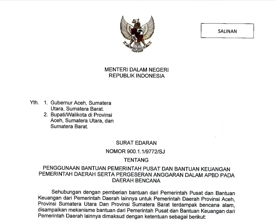 Pedoman tersebut diatur dalam Surat Edaran (SE) Nomor 900.1.1/9772/SJ tentang Penggunaan Bantuan Pemerintah Pusat dan Bantuan Keuangan Pemerintah Daerah (Pemda) serta Pergeseran Anggaran dalam APBD Daerah Bencana.
