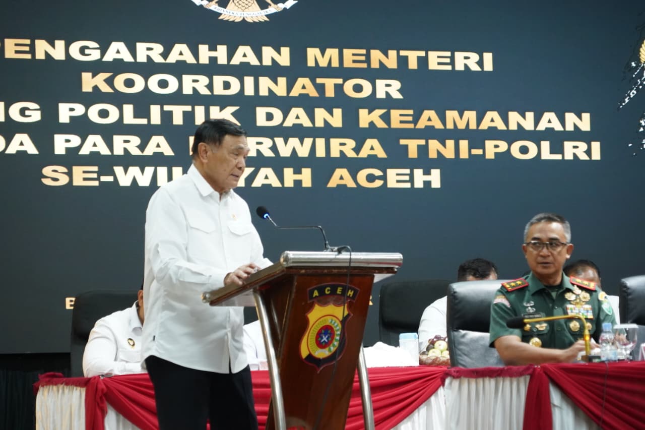 BANDA ACEH — Penanews.co.id – Menteri Koordinator Bidang Politik dan Keamanan (Menkopolkam) Republik Indonesia, Jenderal TNI (Purn) Djamari Chaniago, memberi pengarahan kepada jajaran TNI dan Polri se-Wilayah Aceh. Kegiatan strategis tersebut berlangsung di Gedung Presisi Mapolda Aceh dan diikuti oleh para perwira serta personel dari berbagai satuan di seluruh Aceh, Rabu (26/11/25)