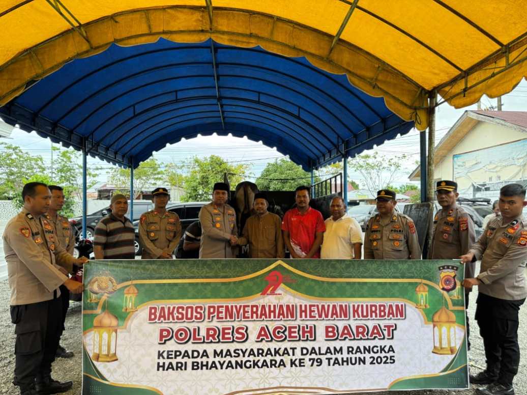 MEULABOH – Dalam rangka menyambut Hari Bhayangkara ke-79 sekaligus memperingati Idul Adha 1446 H, Polres Aceh Barat menunjukkan kepedulian sosialnya dengan menyalurkan lima ekor sapi kurban kepada masyarakat dan lembaga keagamaan di wilayah Kabupaten Aceh Barat, Kamis (5/6/2025).