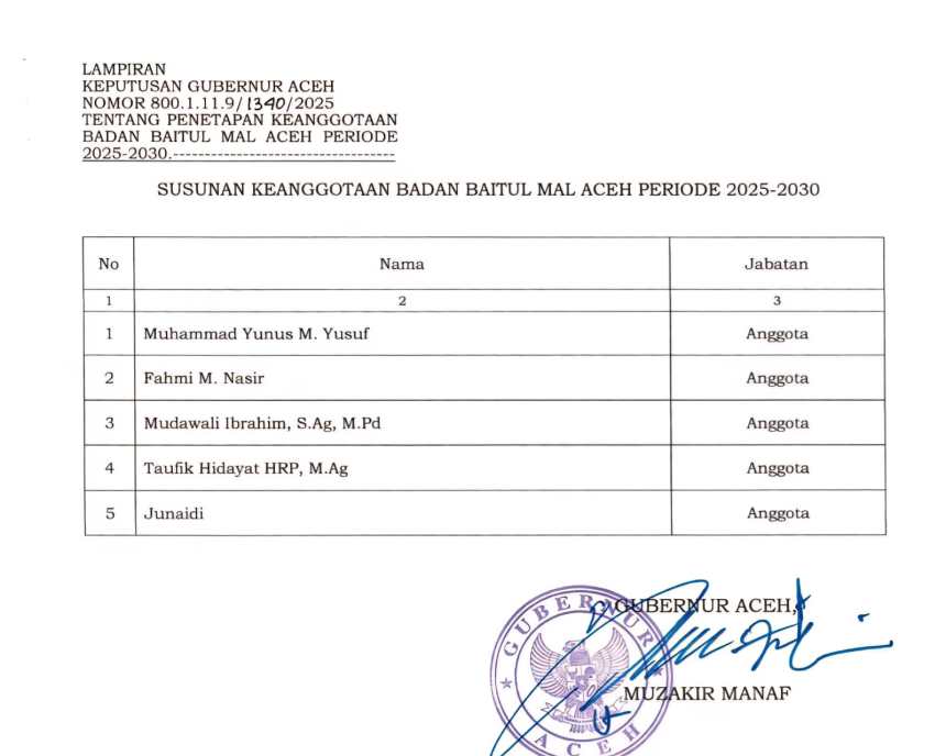 Penetapan tersebut tertuang dalam Surat Keputusan Gubernur Aceh Nomor 800.1.11.9/1340/2025 tentang Penetapan Keanggotaan Badan Baitul Mal Aceh Periode 2025–2030, yang ditandatangani langsung oleh Gubernur Muzakir Manaf pada Kamis, 6 November 2025.