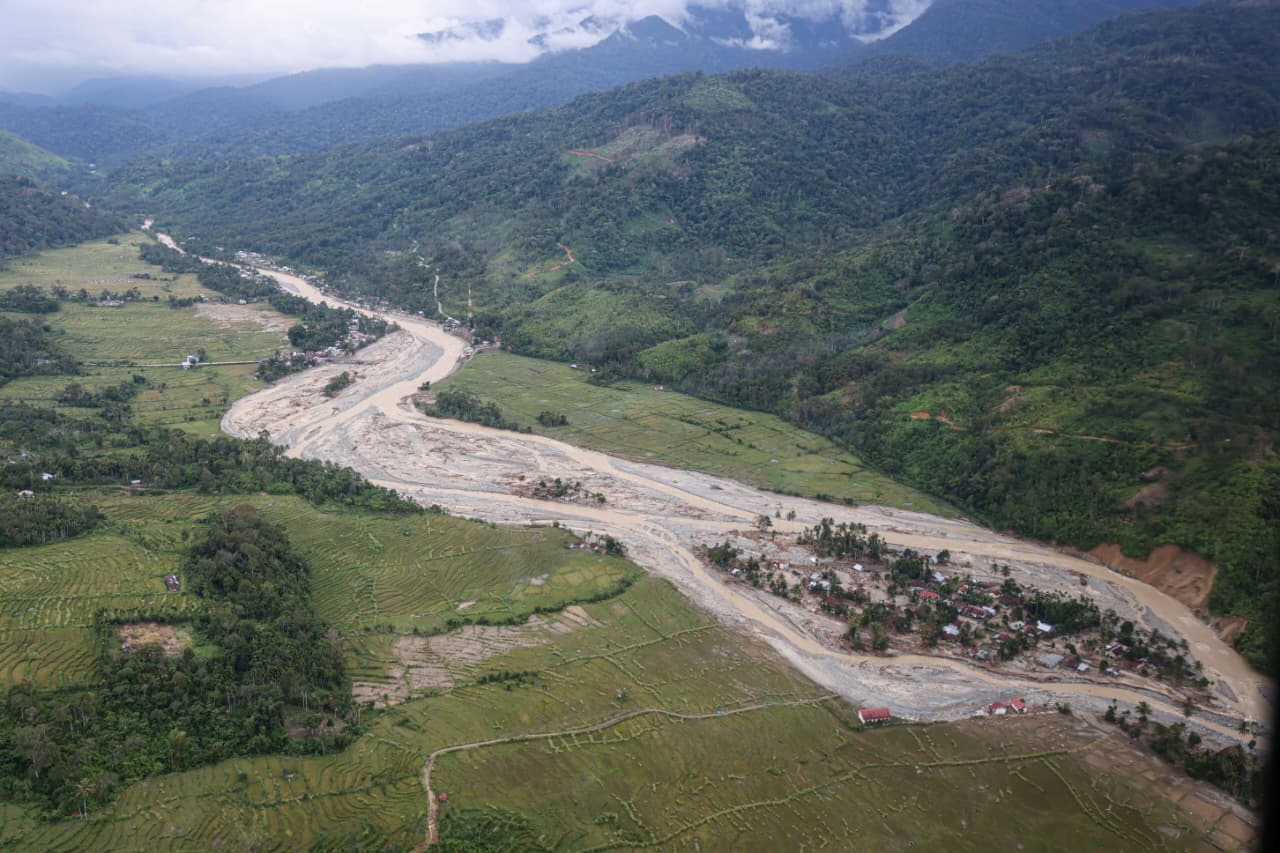 Setibanya di lokasi, Mualem meninjau langsung titik kerusakan, termasuk jembatan utama penghubung Nagan Raya dan Aceh Tengah yang putus diterjang banjir bandang. Sementara dari udara, ia menyaksikan sejumlah kampung yang hancur, bahkan sebagian rumah warga kini berada di tengah aliran sungai karena sungai yang meluas.