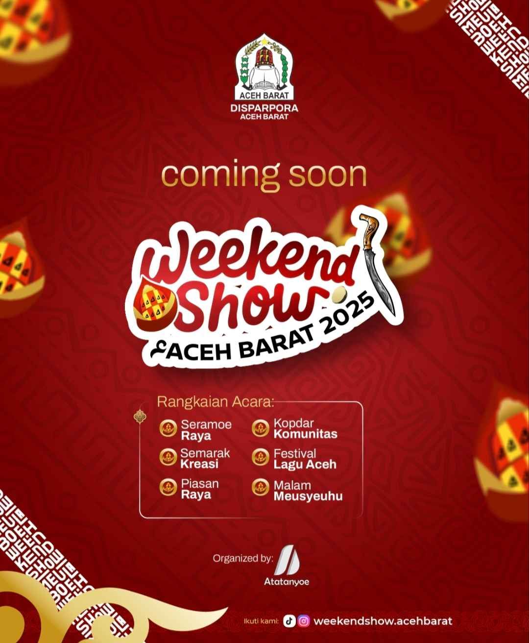 “Ini adalah bentuk tanggung jawab kami dalam menjaga jati diri masyarakat Aceh Barat. Weekend Show 2025 adalah Perhelatan Budaya yang merupakan napas dari kehidupan sosial kita, dan sudah saatnya kita hidupkan kembali budaya yang ada dibumi Teuku Umar yang menjadi kebanggaan bersama,” ujar Bupati Tarmizi dilansir rri.co.id, Rabu (6/8/2025).