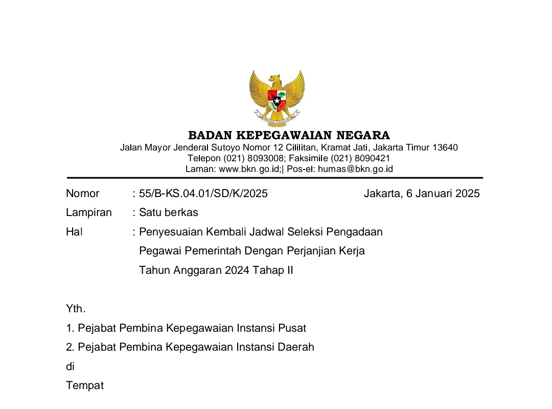 Aturan tersebut tertuang melalui Surat Plt. Kepala BKN Nomor 55/B-KS.04.01/SD/K/2025 tanggal 6 Januari 2025 perihal Penyesuaian Kembali Jadwal Seleksi Pengadaan Pegawai Pemerintah Dengan Perjanjian Kerja Tahun Anggaran 2024 Tahap 2.