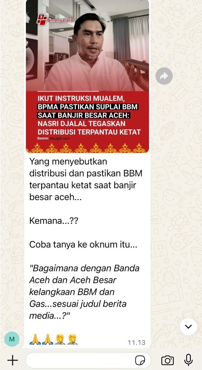 Dalam posting di medsos itu menyebutkan, “Ikut Instruksi Mualem, BPMA Pastikan Suplai BBM Saat Banjir Besar Aceh, Nasri Djalal Tegaskan Distribusi Terpantau Ketat”, membuat warga bertanya kemana oknum itu.