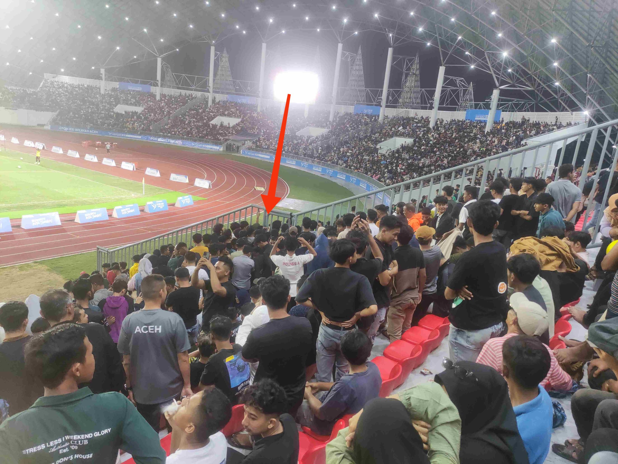 Beberapa diantaranya memaksa mendobrak pagar pembatas tribun barat untuk menyebrang ke tribun Utara m nghindari hujan, sehingga pagar jebol.