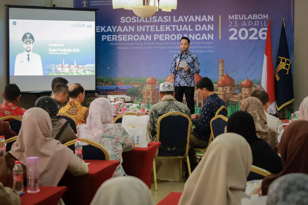 MEULABOH – Penanews.co.id – Kementerian Hukum dan Hak Asasi Manusia melalui Kantor Wilayah Aceh menyelenggarakan sosialisasi terkait layanan kekayaan intelektual dan pendirian perseroan perorangan di Aula Hotel Portola Tiara, Kamis (23/4/2026).