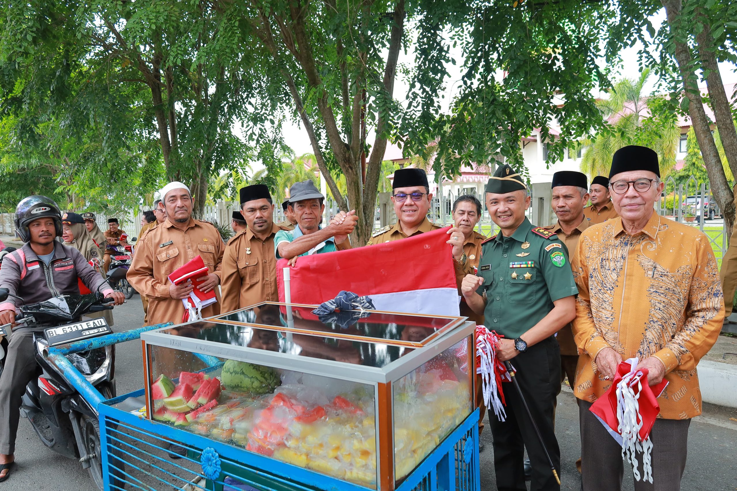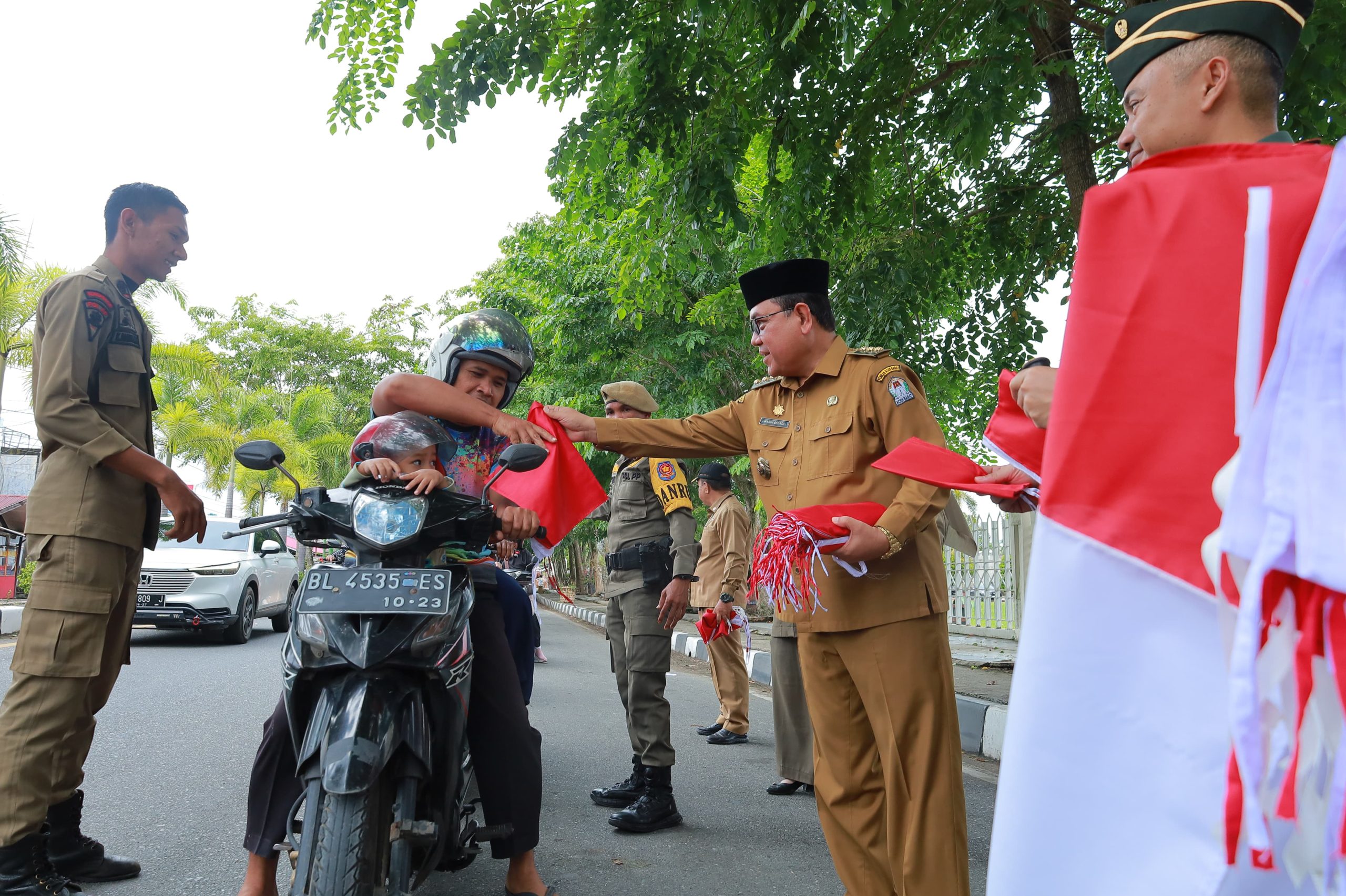 Usai apel gabungan, Pj Bupati Mahdi Efendi bersama unsur Forkopimda dan para kepala dinas beserta para peserta upacara ikut bersama-sama membagikan bendera merah putih, di depan kantor bupati Aceh Barat.