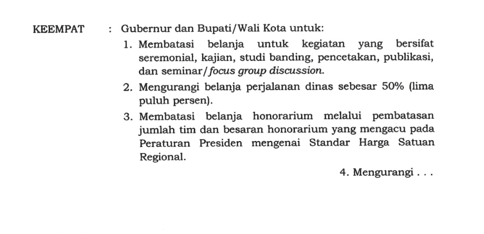 “1. Membatasi belanja untuk kegiatan yang bersifat seremonial, kajian, studi banding, pencetakan, publikasi, dan seminar/focus group discussion.” ditulis dalam Diktum Keempat instruksi presiden itu.