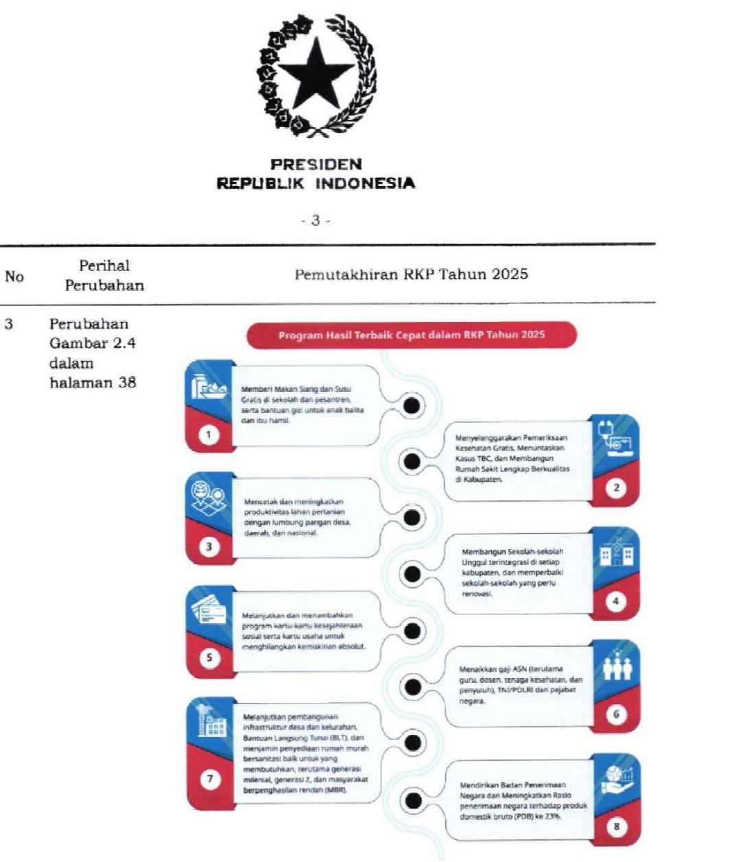 Kebijakan tersebut tertuang dalam Peraturan Presiden (Perpres) Nomor 79 Tahun 2025 tentang Pemutakhiran Rencana Kerja Pemerintah Tahun 2025. Aturan ini resmi berlaku sejak 30 Juni 2025.