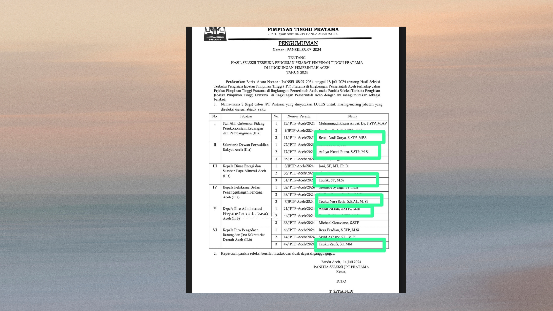 Enam nama ini merupakan hasil seleksi terbuka JPT Pratama di lingkungan Pemerirtah Aceh yang diumumkan oleh panitia seleksi pada 14 Juli 2024. Tim seleksi dipimpin oleh T Setia Budi, bekas Sekretaris Daerah Aceh.