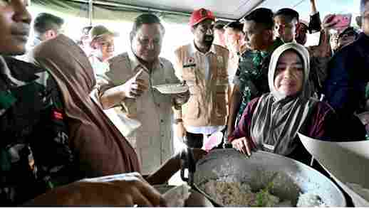 Presiden Prabowo kemudian bergerak menuju dapur umum untuk meninjau langsung persiapan distribusi pangan untuk pengungsi. Di sana, Presiden berbincang dengan para relawan dan memastikan stok logistik tetap tersedia. Kepala Negara bahkan turut mencicipi nasi dan ikan tongkol, menu makan siang yang disiapkan untuk para pengungsi.